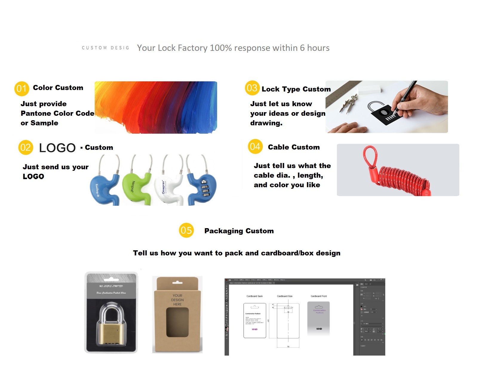 Whether you already have a detailed design, or just have a simple idea, you just need to contact us. Email us or call us to start your lock packaging customization today.